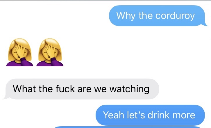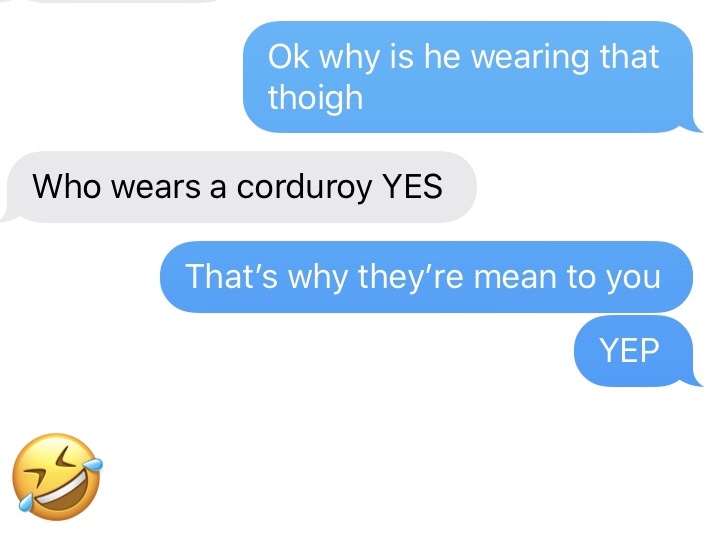 At first our texts were tame. Ha ha, why is the silly boy wearing corduroy? Very silly.